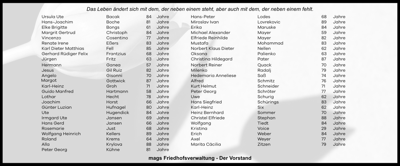 mags hat die Friedhofsverwaltung von der Stadt Mönchengladbach übernommen. Dazu gehört auch, ein Friedhofsrahmenkonzept zu entwickeln, das zur Verbesserung und zum stetigen Fortschritt der städtischen Friedhöfe beiträgt.